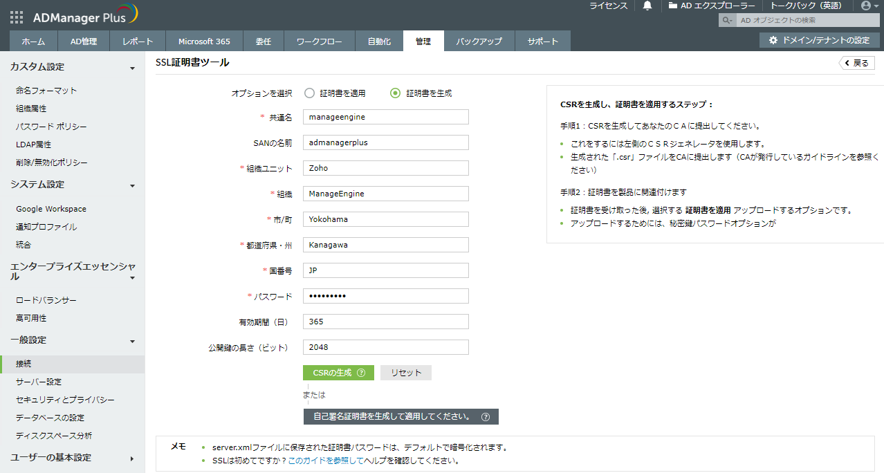 項目名 入力する値 共有名 ADManager Plusが稼働しているサーバーのNetBIOSまたはFQDN SANの名前 関連付ける追加のホスト名など(SAN) 組織ユニット 証明書に含める部署名 組織 組織の正式名称 市/村 組織所在地の市区町村 都道府県・州 組織所在地の都道府県 国番号 組織が属する国の2桁の番号(日本の場合:JP) パスワード 最低6文字以上のパスワード(※証明書のインストール時に使用します) 有効期限(日) 証明書の有効期限を設定可能(デフォルト値:90日) 公開鍵の長さ(ビット) 公開鍵の長さを指定可能(デフォルト値:1024日) - [CSRの生成]をクリック