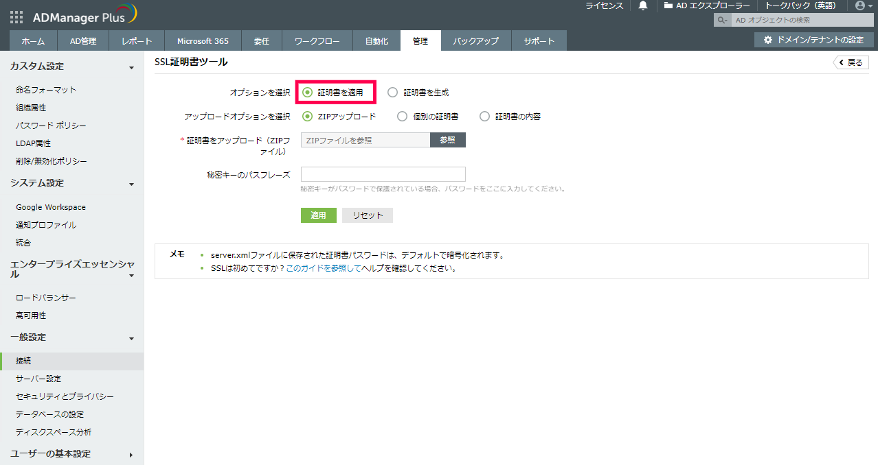 CAからSSL証明書を受領したのち、次の手順によりADManager Plusへ適用します。