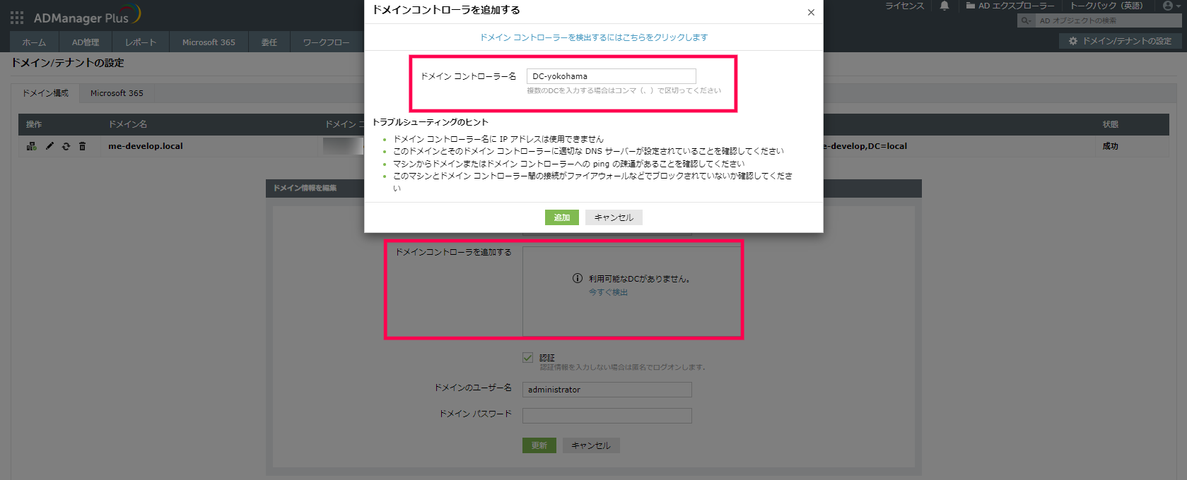 ADManager Plusの「ドメイン設定」に、管理対象ドメインに存在するすべてのドメインコントローラーを追加していないため。