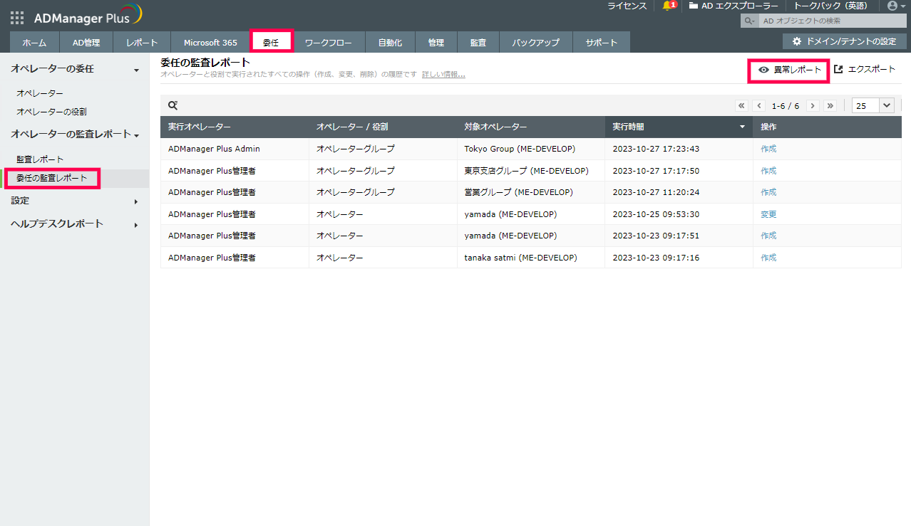 [委任]タブ-->[委任の監査レポート]-->画面右上の[異常レポート]をクリックしてください。