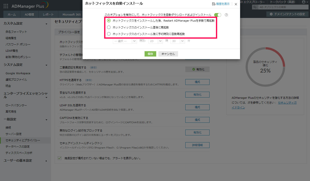 ・ホットフィックスのインストール後に予約時刻に自動再起動:指定したスケジュール頻度に基づいて再起動します。