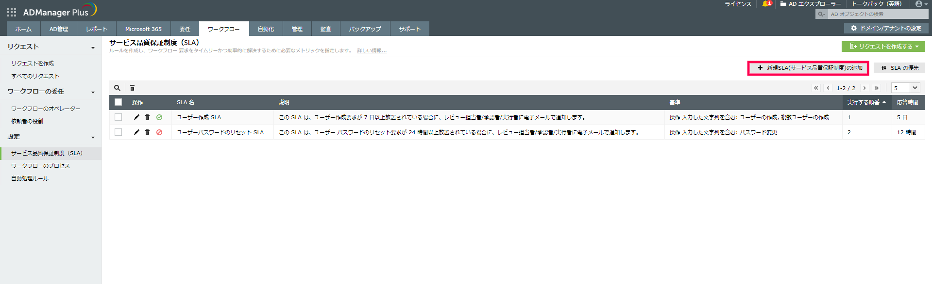 - [ワークフロー]タブ-->[設定]-->[サービス品質保証制度(SLA)]-->[新規SLA(サービス品質保証制度)の追加]をクリック