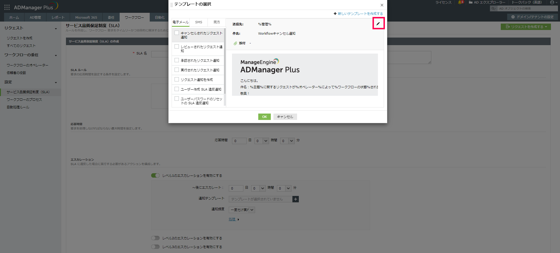 ・通知テンプレート:SLA違反の通知テンプレートを選択(作成/編集)
