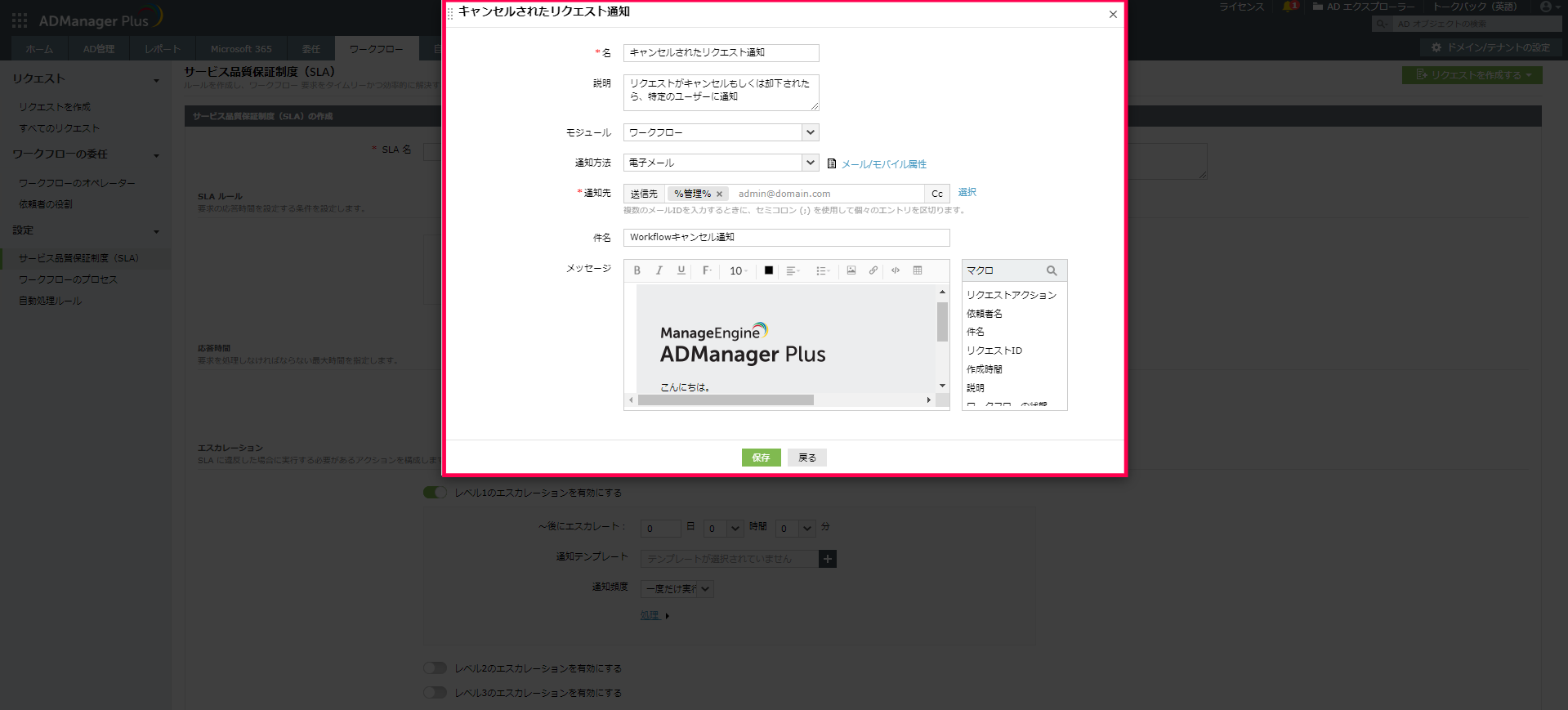 - エスカレーション:SLA違反時のフローとして、「レベル1」~「レベル3」から任意のレベルを設定