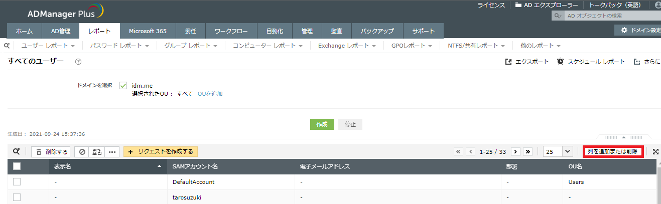 - ADManager Plusにて、「すべてのユーザー」レポートを開きます。