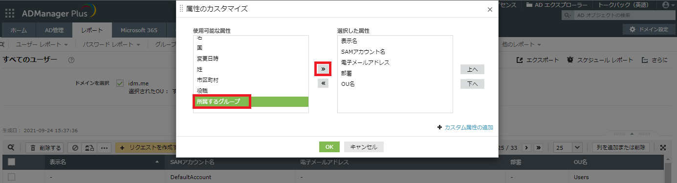 - 「所属するグループ」を[選択した属性]リストに移動します。