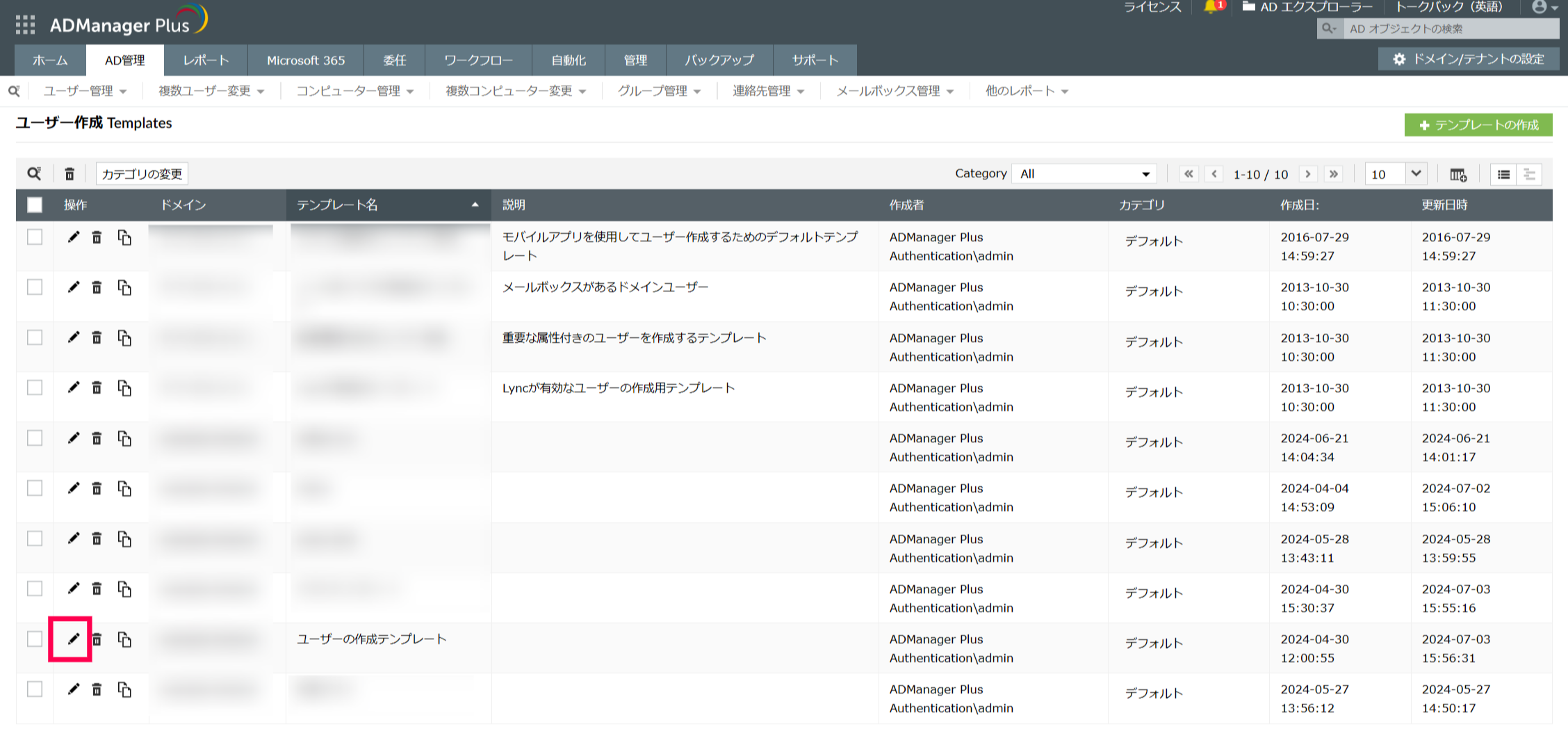 - 新規ユーザーを作成する際に使用するテンプレートの「編集」アイコンをクリックします。