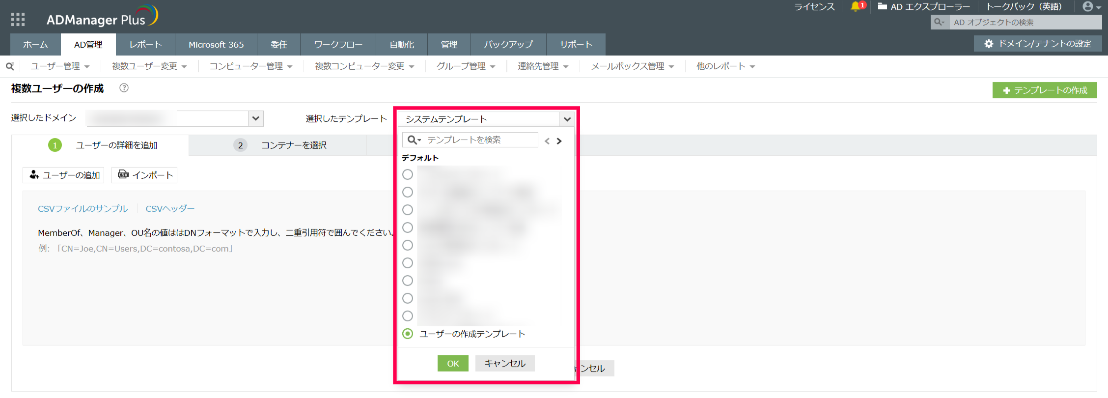 - 「AD管理」>「ユーザー管理」>「ユーザーの作成テンプレート」を開きます。