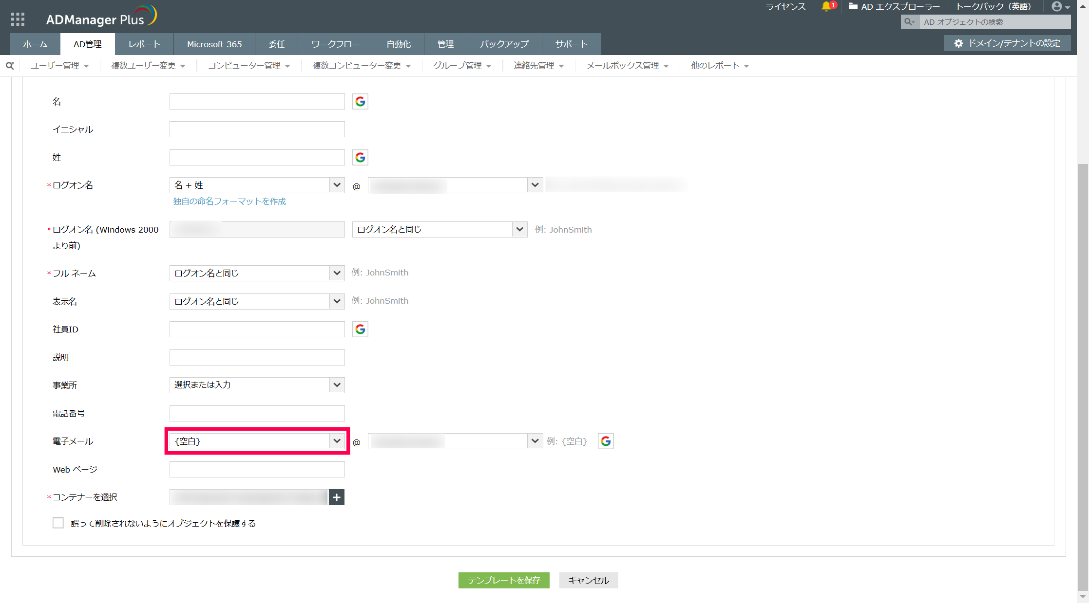 ユーザーの作成テンプレートでは、mail属性の初期設定として、ログオン名をメールアドレスとして登録するように設定されています。