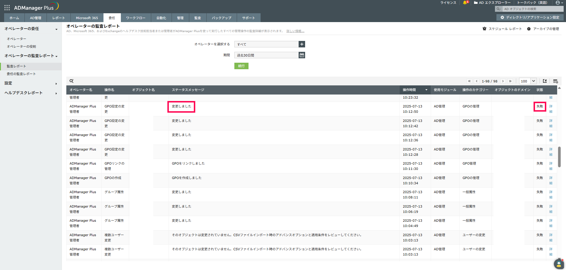 [委任]→[監査レポート]の「状態」ステータスにて、実行が成功したタスクでも「失敗」と表示される不具合が発生する場合があります。