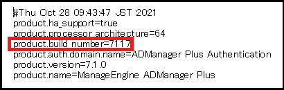 ADManager Plusが起動しない場合のビルド番号の確認方法 作成日:2017年3月14日 | 更新日:2021年11月10日 設定と操作 ADManager Plusが起動しない場合、product.confファイルより確認いただけます。 次の手順をご参照ください。 <ADManager Plus インストールディレクトリ>\confへ移動します。 product.confをテキストエディターで開きます。 「product.build_number=」を検索します。 このナレッジの総閲覧回数: 1,595 関連ナレッジ: メールボックスを作成するための前提条件 ADManager Plusインストールサーバーの移行手順【MSSQL】 ADManager Plus のバックアップとリストア(ビルド7126以下用) ADManager Plusをサービス起動させる方法