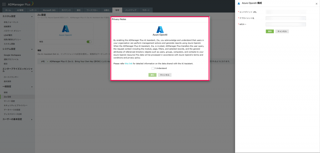 「ADManager PlusのAIアシスタント「Zia」を有効化することにより、お客様の組織内のユーザーがAzure OpenAIを使用して管理操作を実行し、レポートを生成できることを認識し、理解したものとみなされます。ADManager PlusのAIアシスタント「Zia」が呼び出されると、ADManager Plusはユーザーのクエリ、モジュール、ページ、フィルター、選択されたレコードを含むリクエストコンテキスト、およびユーザー、グループ、コンピューター、連絡先などの参照されるディレクトリオブジェクトの一般属性を、お客様のAzure OpenAIリソースに転送します。このデータはAzure OpenAIの利用規約およびプライバシーポリシーに従って処理されます。AIアシスタントと共有されるデータの詳細については、こちらのリンクをご参照ください。」