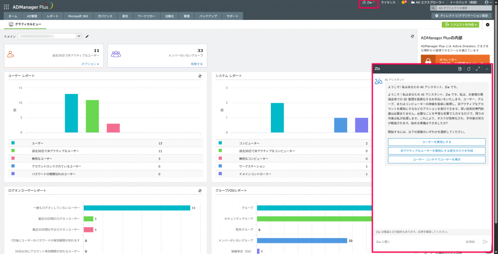 本ページでは、ADManager Plusのビルド8032に追加された新機能「Zia - AIチャットアシスタント」について説明します。