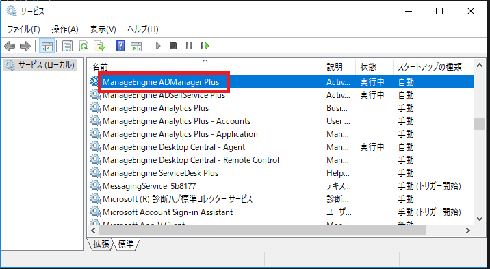 - サービス(services.msc)を開き、「ManageEngine ADManager Plus」が登録されていることを確認