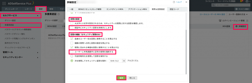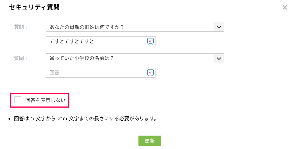 - 「回答の設定」→「認証中にセキュリティ回答を非表示にする」を無効化します(チェックボックスのチェックを外す)。