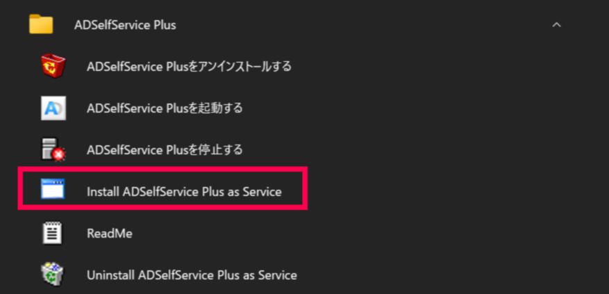 - スタートメニュー→[すべてのプログラム]→[ADSelfService Plus]をクリックし、[Install ADSelfService Plus as Service]をクリック