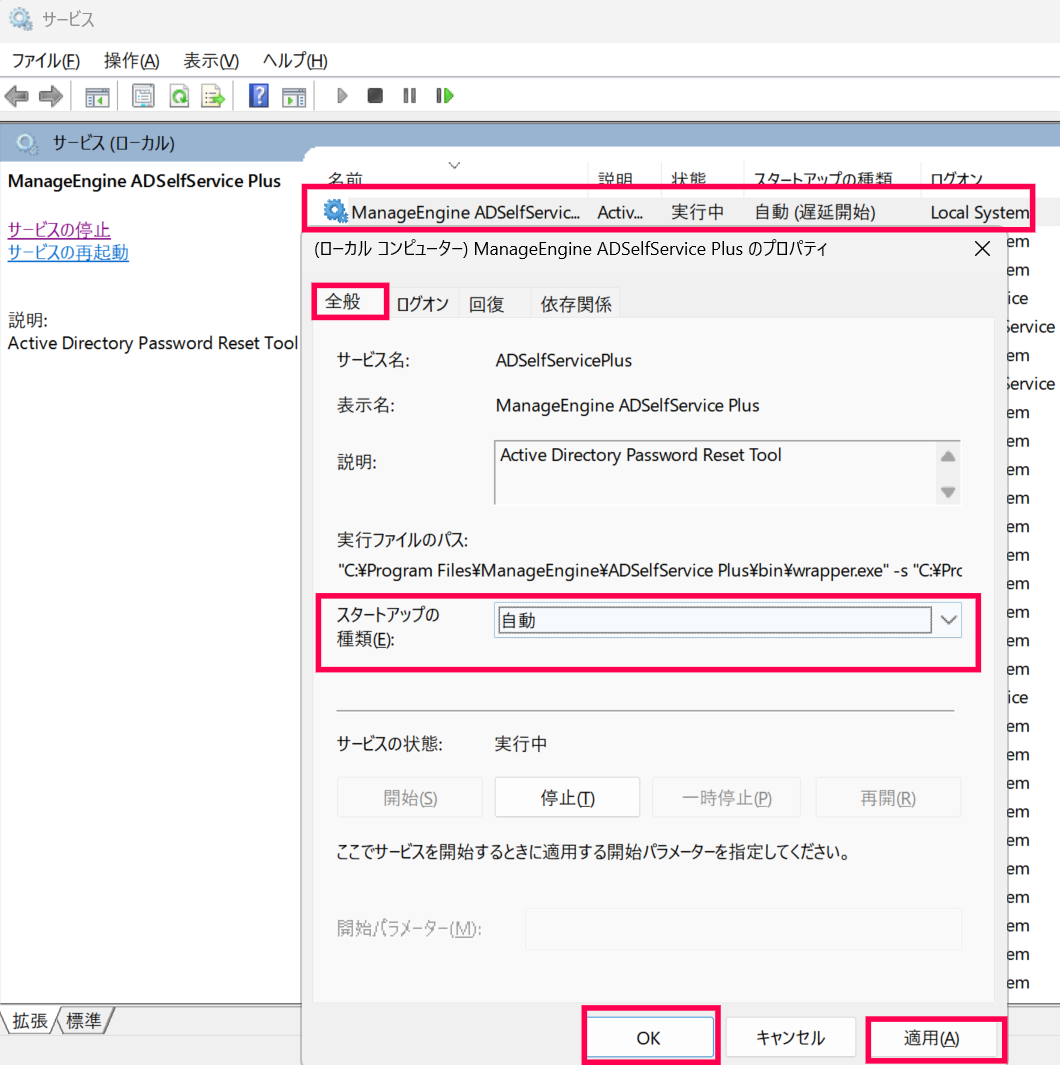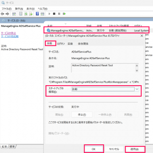 - サービス(services.msc)を開き、「ManageEngine ADSelfService Plus」を右クリックして[プロパティ]をクリック