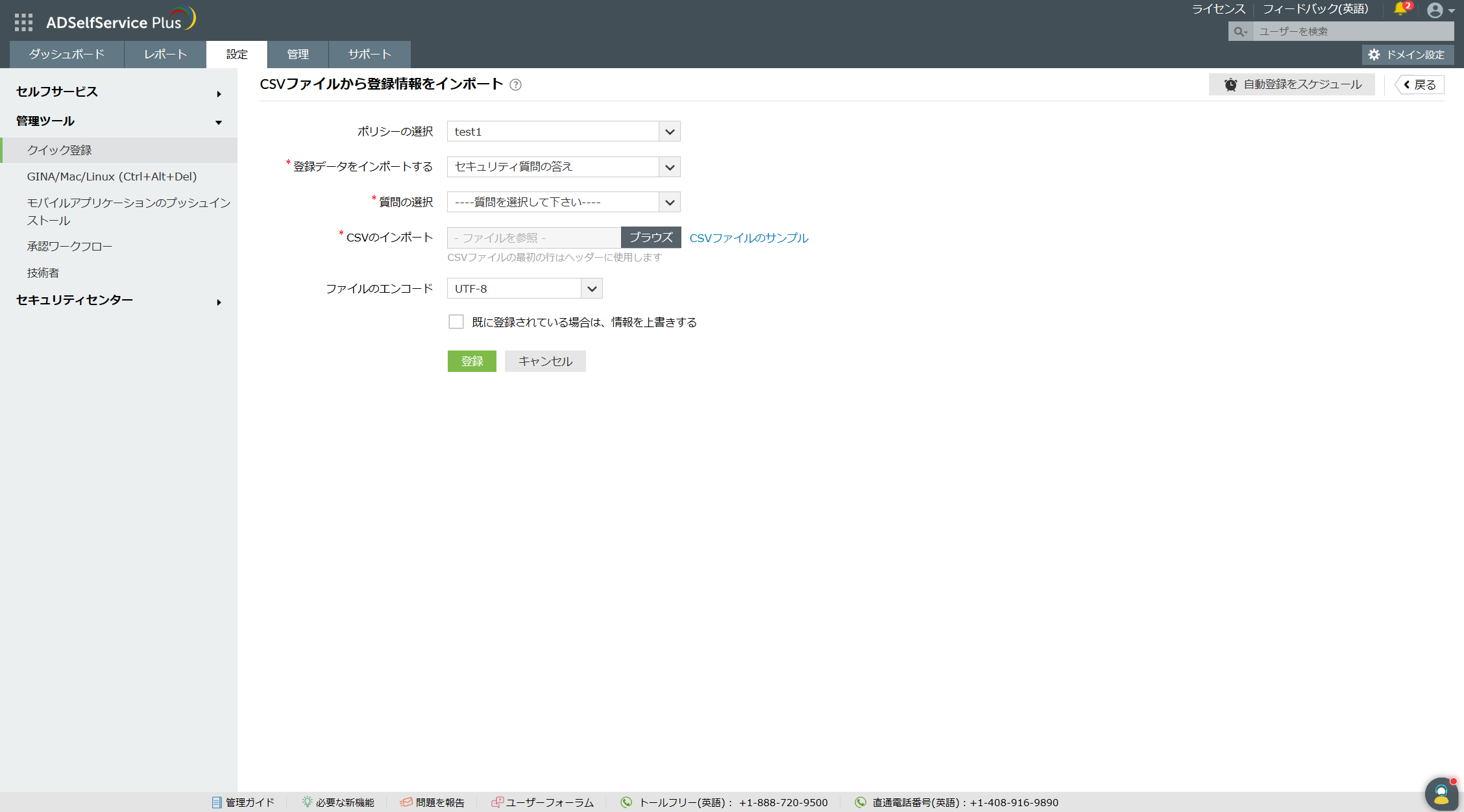 ADSelfService Plusでは、[クイック登録]→[CSVファイルから登録情報をインポート]にて、CSVファイルからユーザー情報のインポートおよびユーザー登録が可能です。