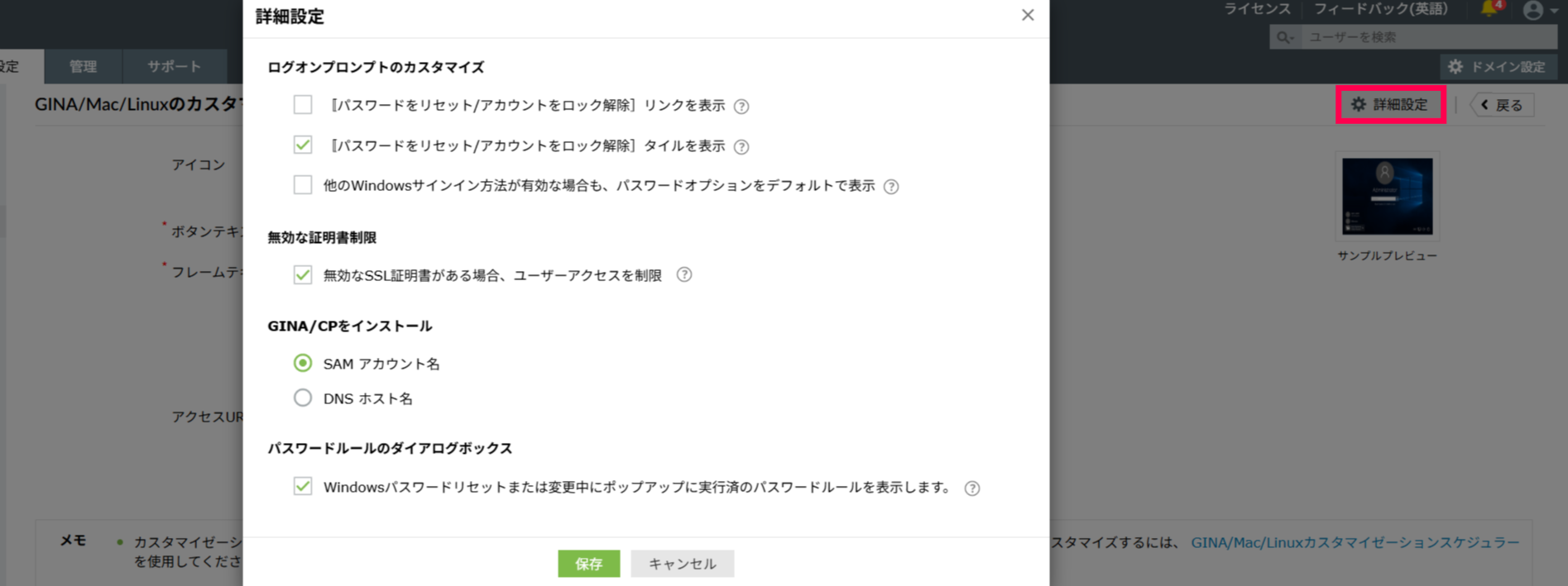 - [設定タブ]>[管理ツール[>[GINA/Mac (Ctrl+Alt+Del)]へ移動