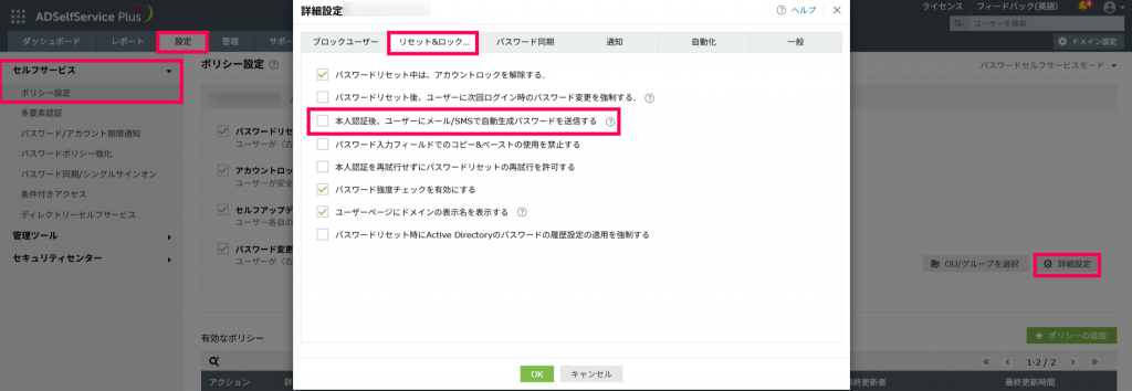 - [設定]タブ→[セルフサービス]→[ポリシー設定]→[詳細設定]→[リセット&ロック解除]に移動します。