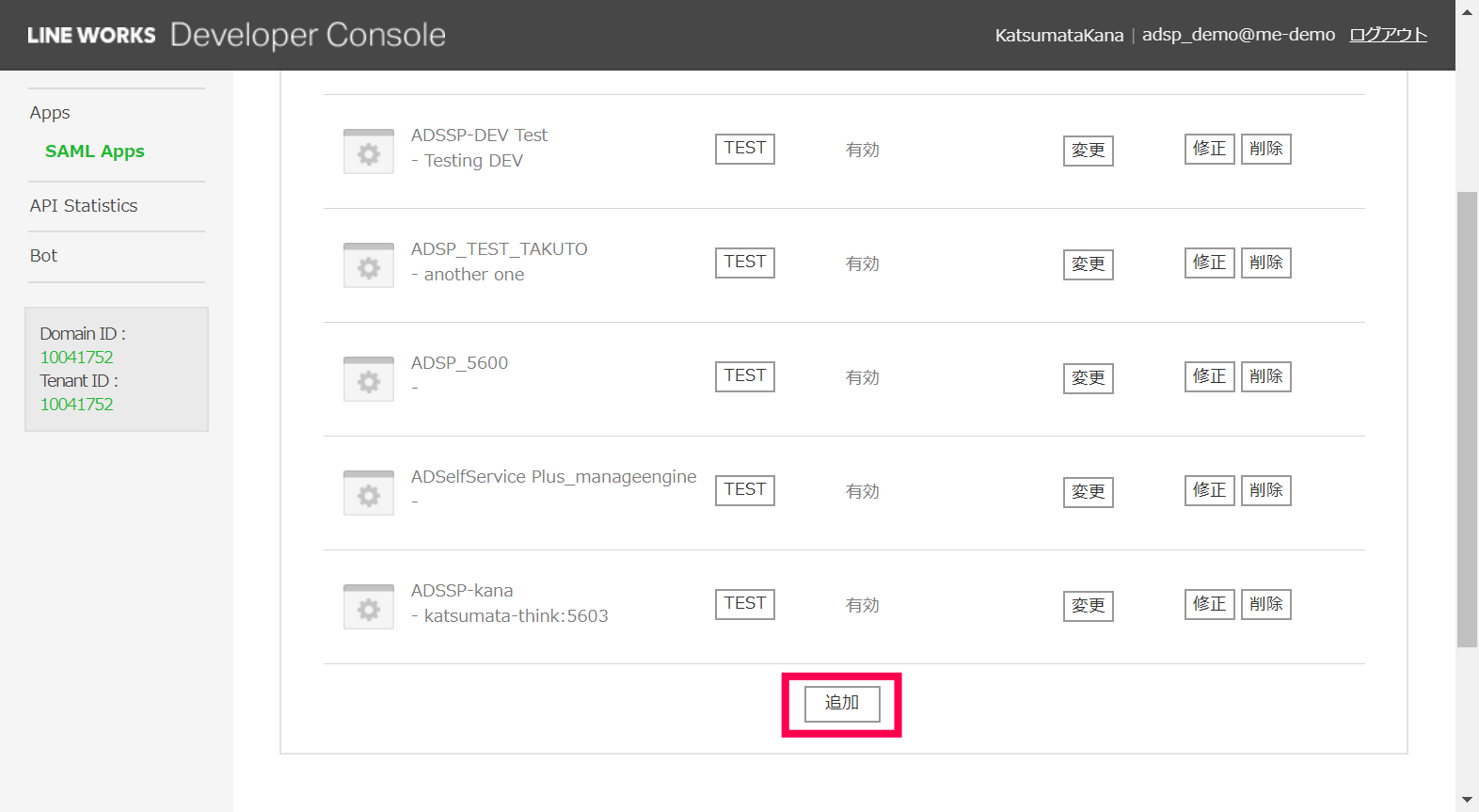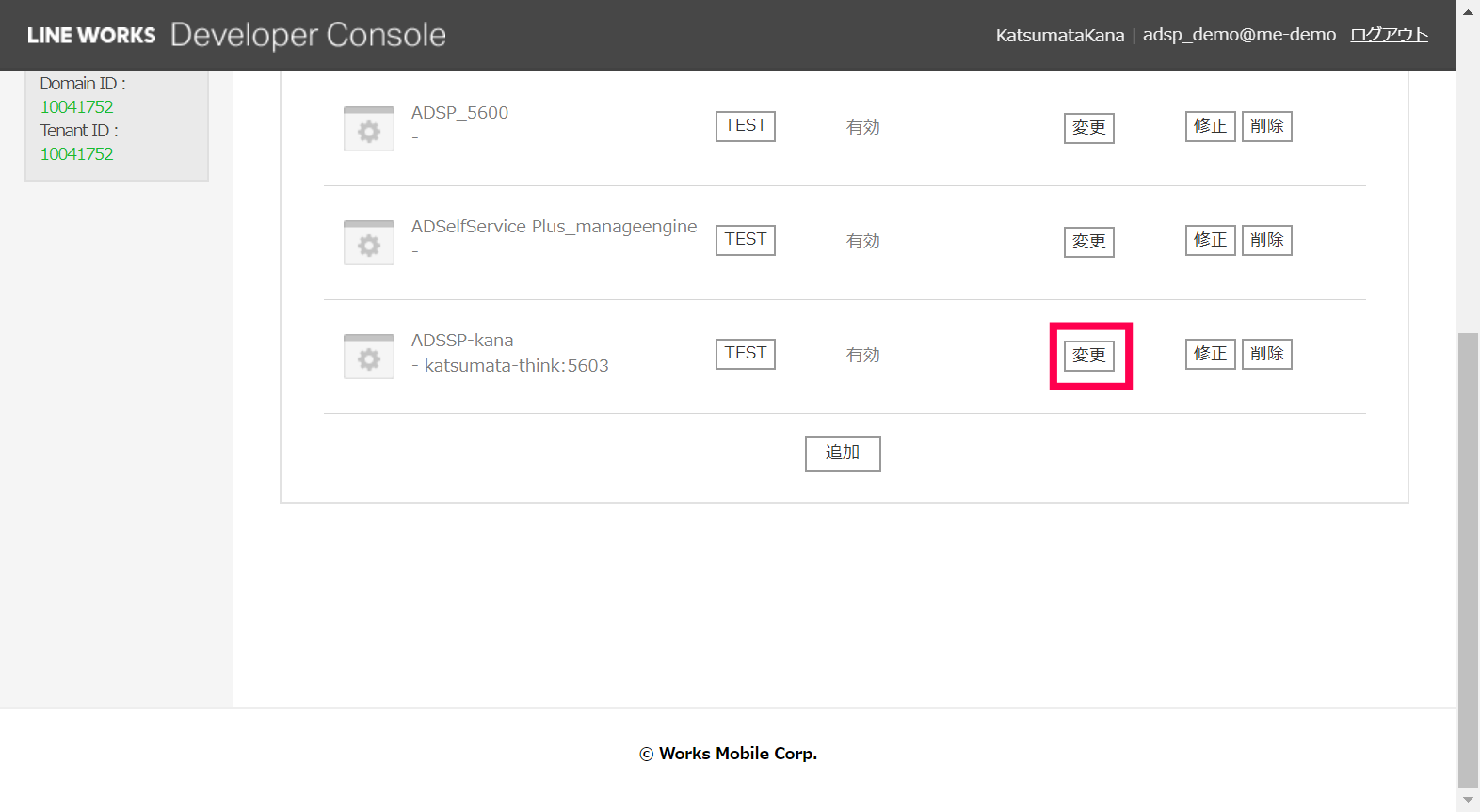 9. App一覧に戻り、作成したアプリケーションの[変更]をクリック