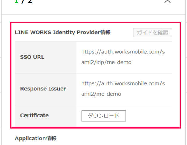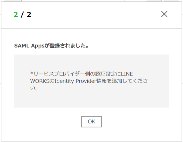 4. ポップアップのLINE WORKS Identity Provider情報を確認、メモを取っておく