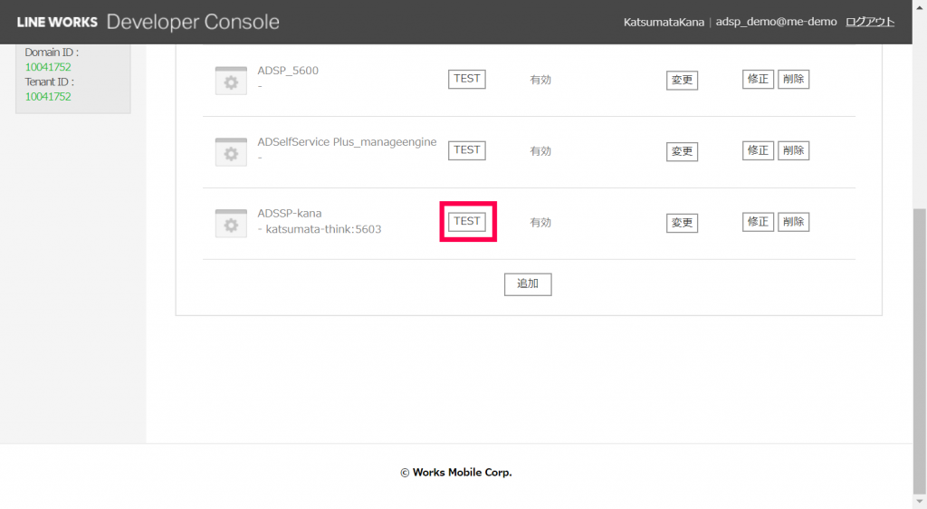 11. App一覧に戻り、作成したアプリケーションの[TEST]をクリックし動作を確認