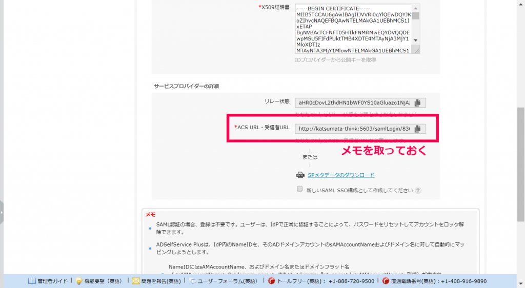 2. ADSelfService PlusのSAML認証のページのサービスプロバイダー情報に記載されている[ACS URL・受信者URL]のメモを取っておく