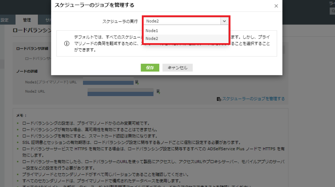 (※条件付きアクセスにより、アクセス制限していないかご確認ください。) - [セカンダリノード]にて、[ノードURL]フィールドに別サーバーにインストールされているADSelfService Plusの