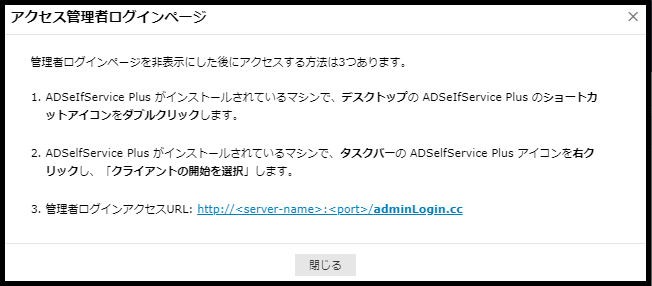 - [一般]タブ-->[ログイン画面に「管理者ログイン」を表示しない]にチェックを入れる