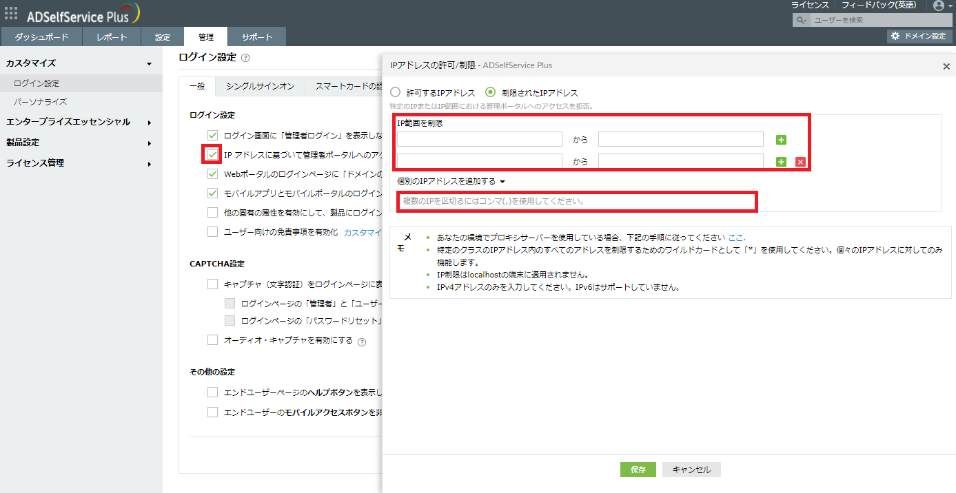 仕様上、「管理者ログインを許可するIPアドレス」および「管理者ログインを制限するIPアドレス」を