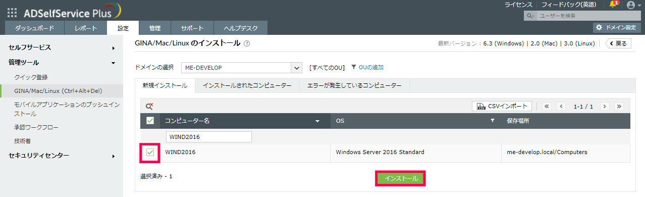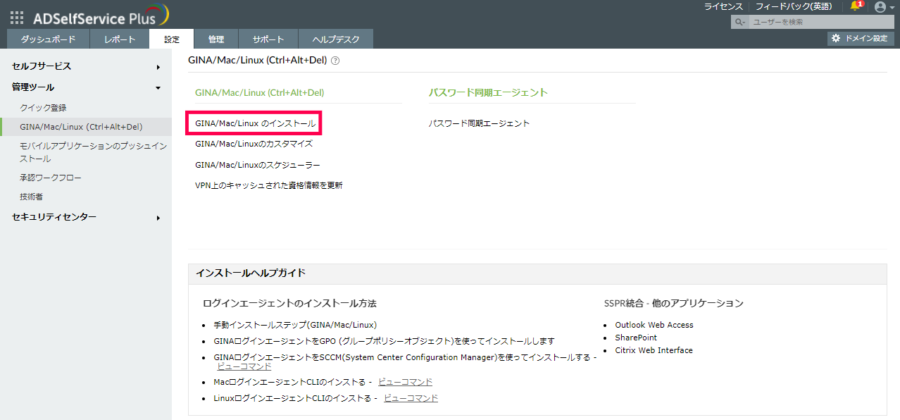 - [設定]タブ-->[管理ツール]-->[GINA/Mac/Linux (Ctrl+Alt+Del)]-->[GINA/Mac/Linuxのインストール]をクリック