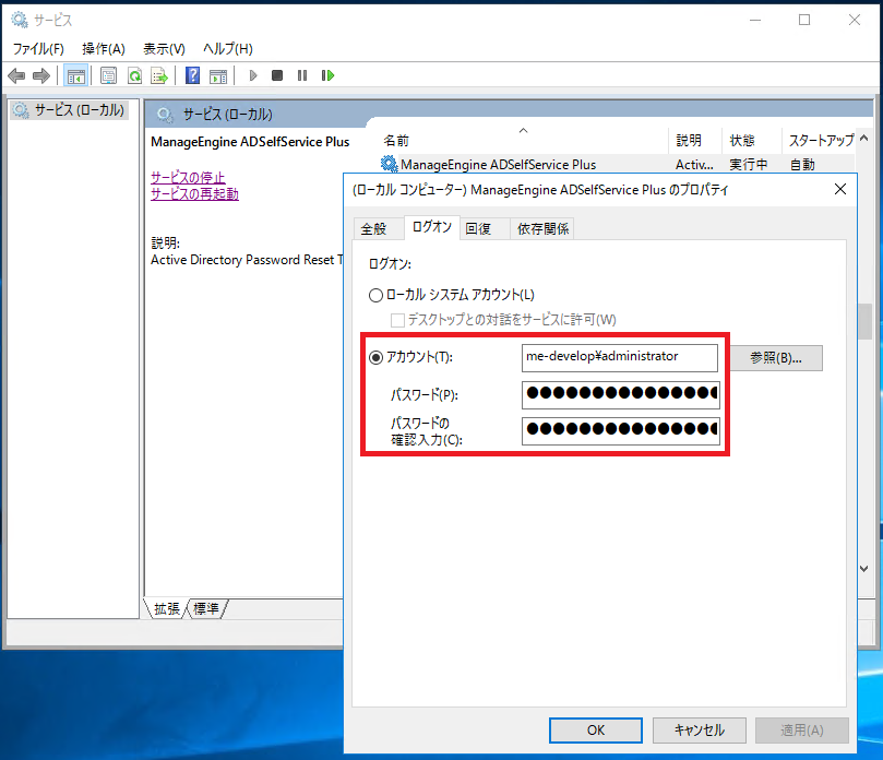 ・ドメイン管理者アカウント(Domain Admins)と同等の権限を持つアカウント - [services.msc]-->[ManageEngine ADSelfService Plus]-->[プロパティ]-->「ログオン」タブにて、