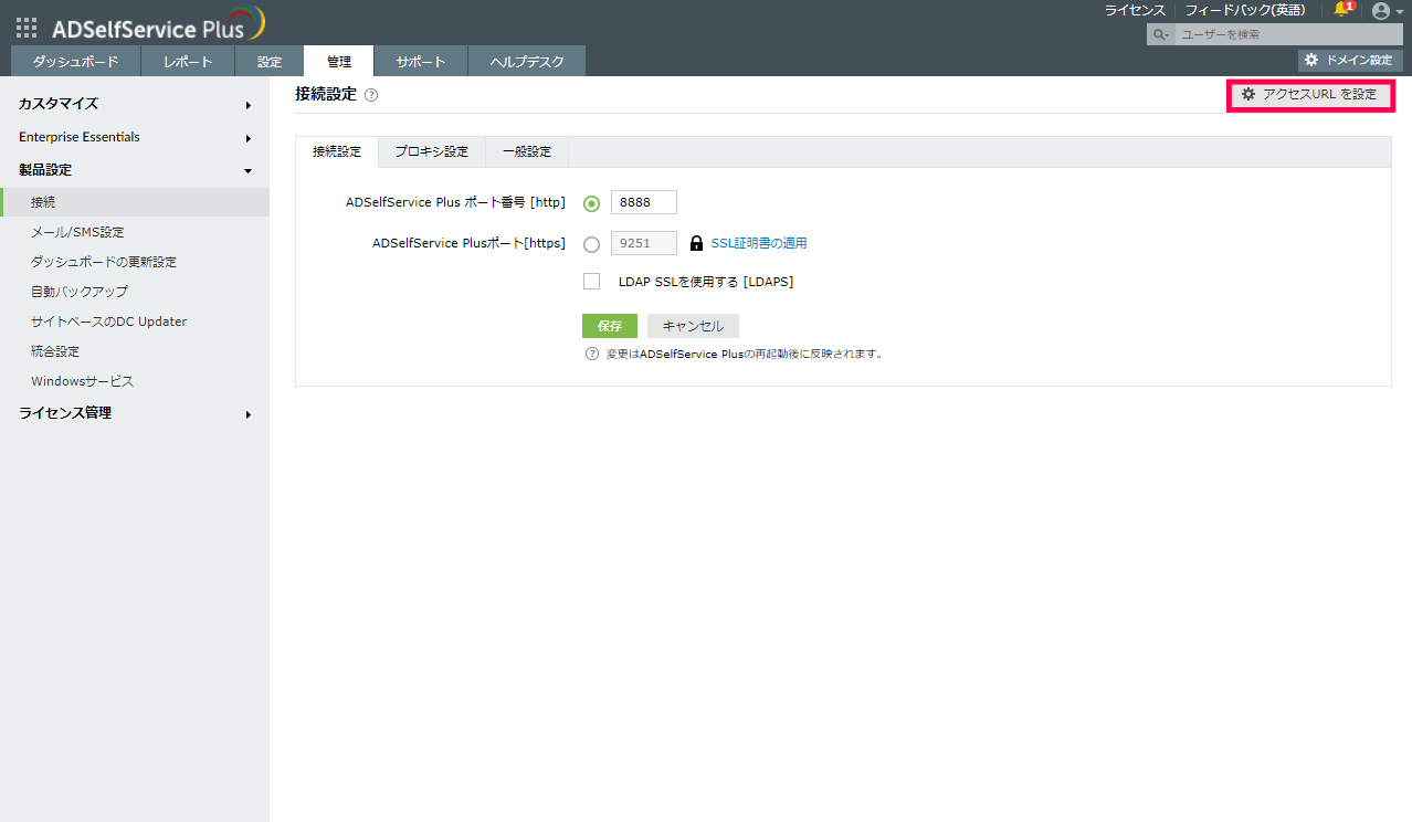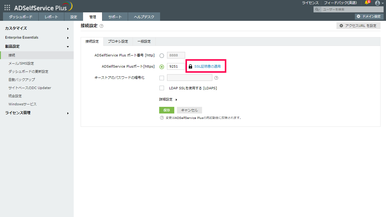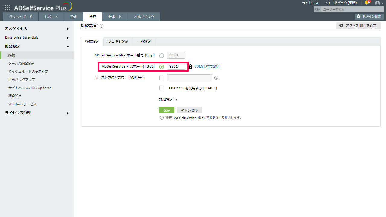 - [管理]タブ-->[製品設定]-->[接続]-->[接続設定]タブ-->[ADSelfService Plusポートの有効化[https]]を選択