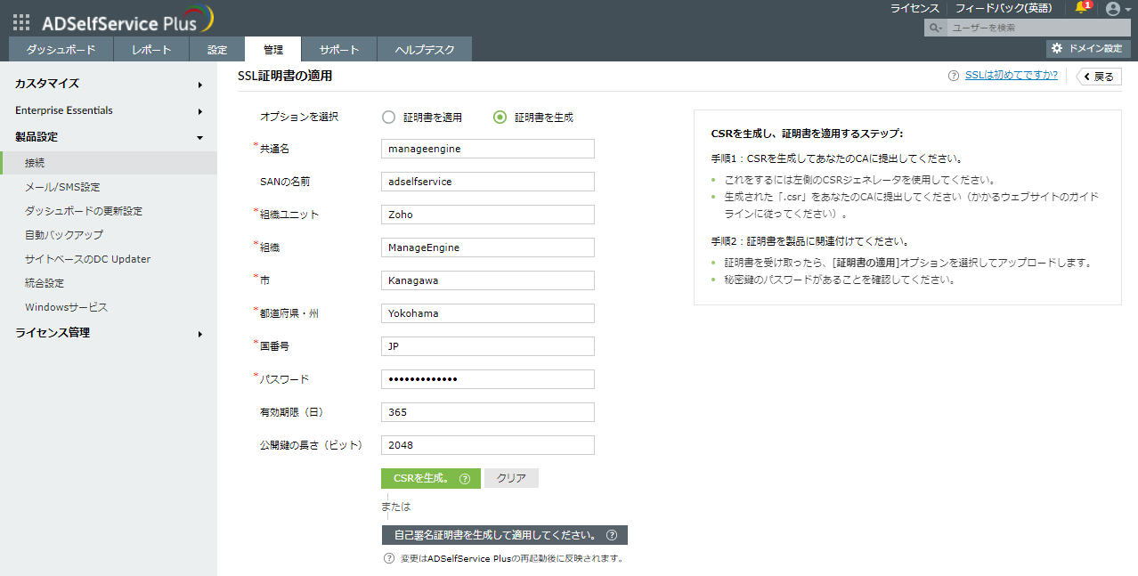 項目名 入力する値 共有名 ADSelfService Plusが稼働しているサーバー名(コモンネーム) SAN名 関連付ける追加のホスト名など(SAN) 所属組織 証明書に含める部署名 組織 組織の正式名称 市区町村 組織所在地の市区町村 都道府県 組織所在地の都道府県 国番号 組織が属する国の2桁の番号(日本の場合:JP) パスワード 最低6文字以上のパスワード(※証明書のインストール時に使用します) 有効期限 証明書の有効期限を設定可能