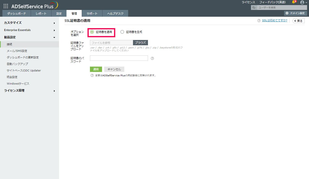 - [管理]タブ-->[製品設定]-->[接続]-->[接続]タブ-->[ADSelfService Plusポートの有効化[https]]にある[SSL証明書の適用]をクリック