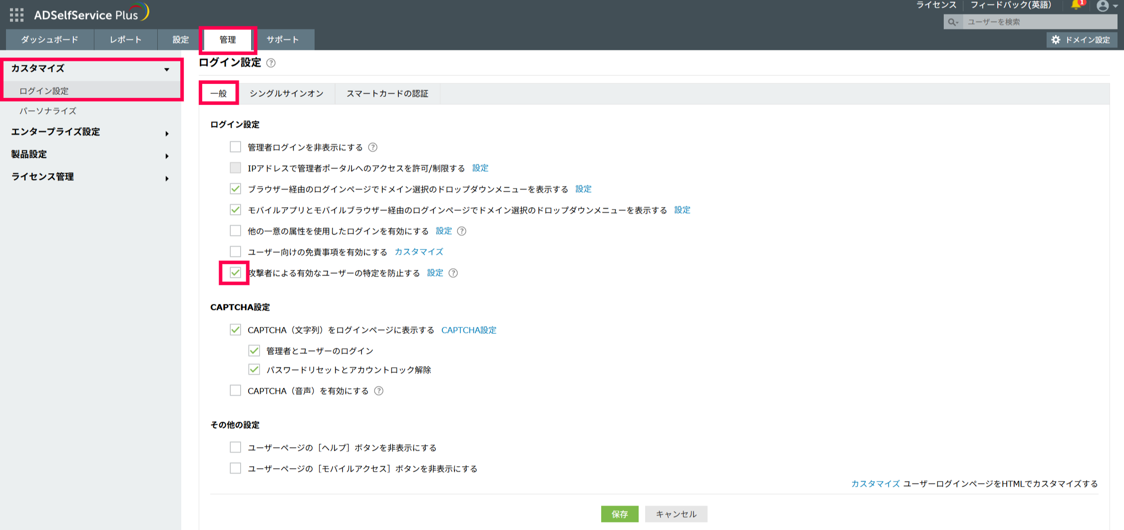 - [一般]タブにある「攻撃者による有効なユーザーの特定を防止する」にチェックを入れる