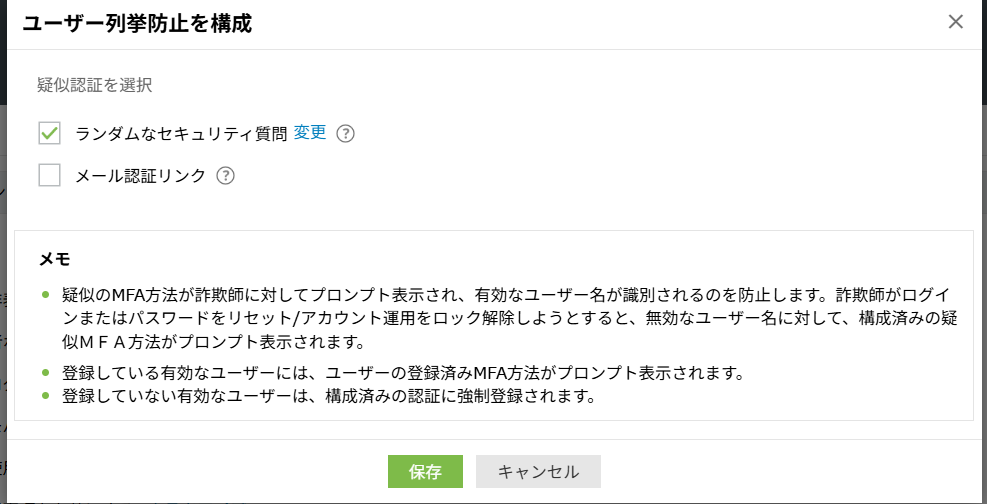 設定可能な疑似MFAは以下の二種類です。- ランダムなセキュリティ質問