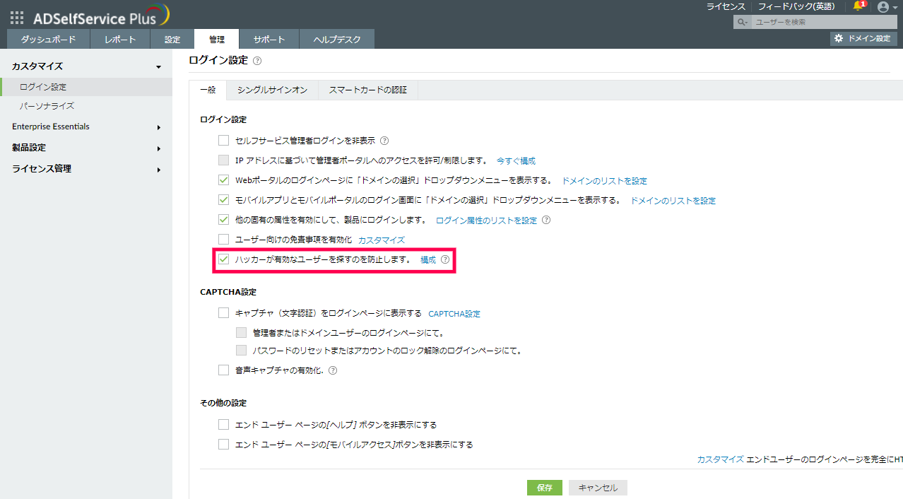 - [一般]タブにある「ハッカーが有効なユーザーを探すのを防止します。」にチェックを入れる