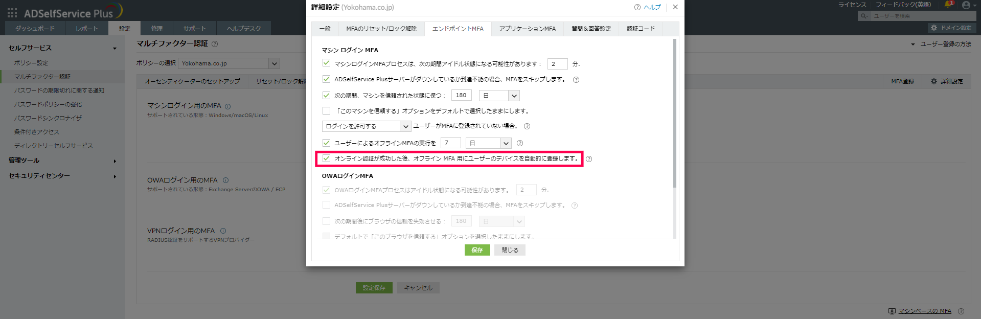 - [エンドポイントMFA]タブにある「オンライン認証が成功した後、オフライン MFA 用にユーザーのデバイスを自動的に登録します。」オプションにチェックを入れる