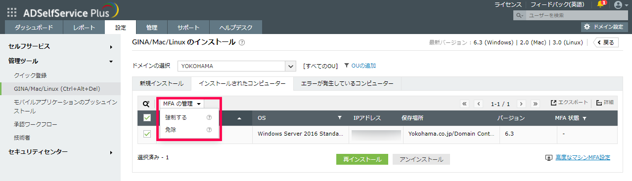 強制するには、対象マシンにチェックを入れ、[MFAの管理]-->[強制]を選択してください。