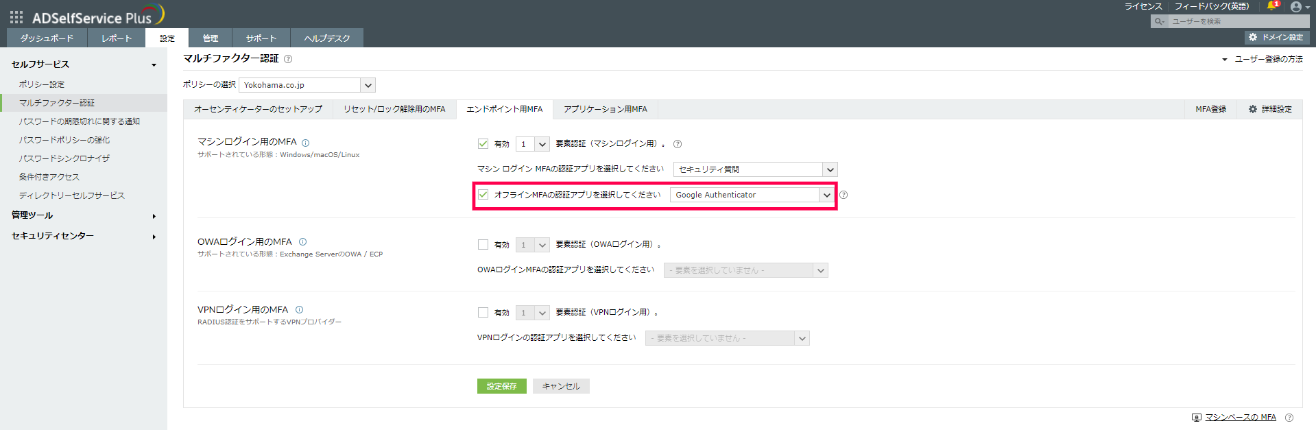 - [マシンログイン用のMFA]の[有効]にチェックを付け、[マシン ログイン MFAの認証アプリを選択してください]にてオンライン用の任意の認証を優先度が高い順(*1)に選択