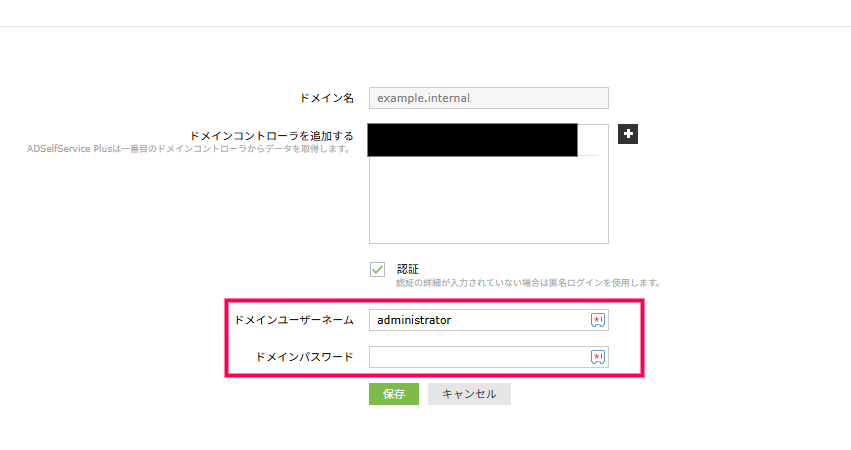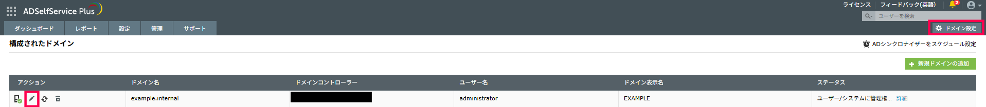 この状態ではデータは読み取りのみの状態ですので、管理機能(パスワードのリセットやアカウントロックの解除)の利用はできません。管理機能を利用するには、画面右上にある「ドメイン設定」リンクから、該当のドメインの編集アイコンをクリックして、管理者権限のあるユーザー名とパスワードを指定して保存してください。