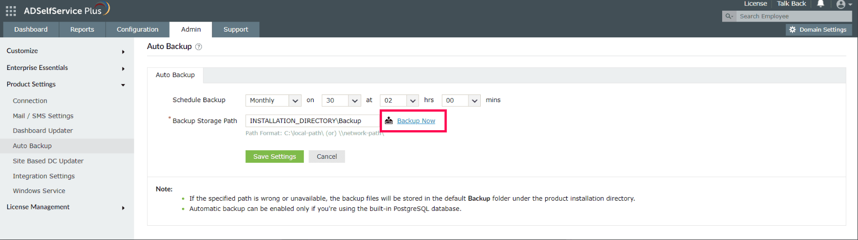 方法2 ADSelfService Plus管理ポータルを使用したバックアップ