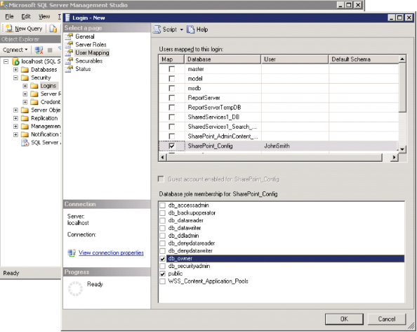 ・左側のペインのユーザーマッピングに移動します。このログインにマップされたユーザーリストで、データベースの横にあるチェックボックスをオンにします。リストで、db_ownerを選択し、OKをクリックします。