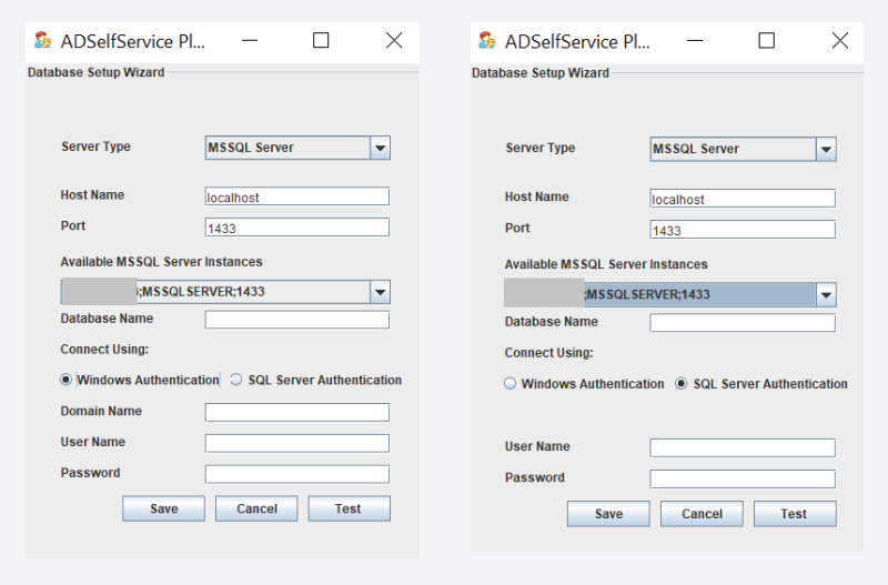 ・ADSelfService PlusがすでにWindowsサービスとして起動している場合、データベースの設定にそのサービスアカウントを使用するか、別のアカウントを作成することができます。別のアカウントを作成する場合は、ADSelfService PlusサービスアカウントがMS SQL serverにアクセスするために必要な権限を保持していることに注意してください。 必要な権限についての詳細は、付録Bを参照してください。