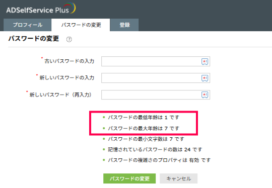 パスワード変更画面および、パスワードリセット画面において、ドメインパスワードポリシーを表示している場合、「パスワードの変更禁止期間」「パスワードの有効期間」に関する表記ミスがございます。