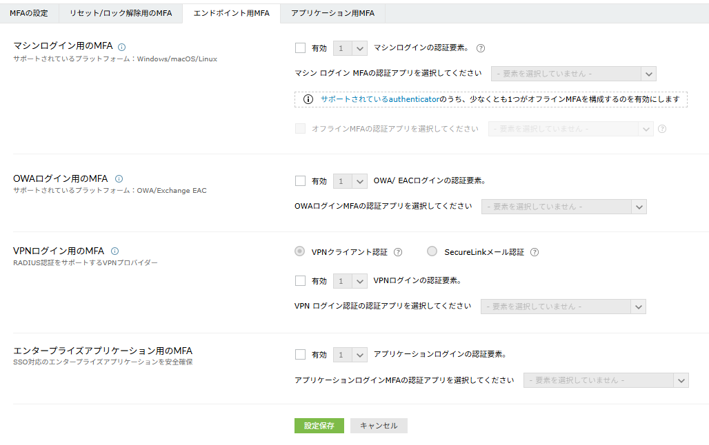 ただし、例外的に「VPNログイン用のMFA」では強制する認証方法の数と有効化する認証方法が一致する必要があるため、ユーザーに任意の認証方法をさせて認証させることはできません。