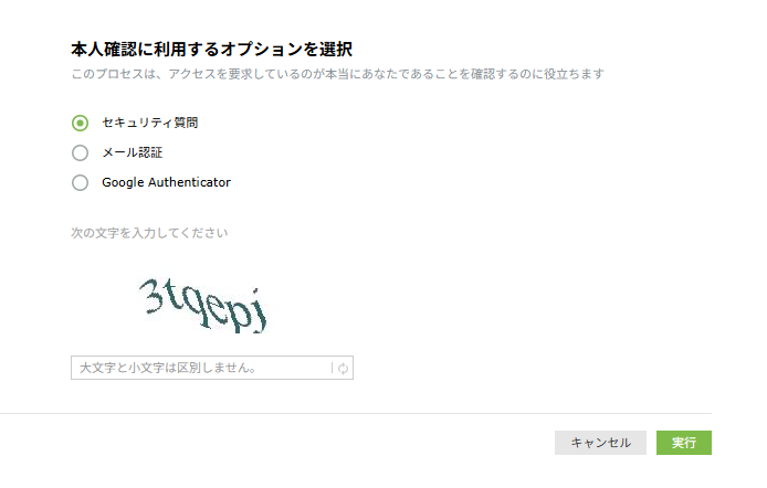 ユーザーは、「メール認証」、「セキュリティ質問&回答」、「Google AUthenticator」のうち、2つの認証を完了する必要があります。