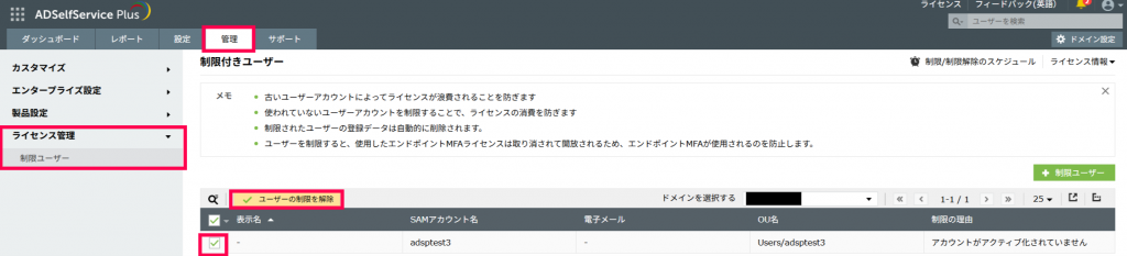 - リストの中から、制限を解除しADSelfService Plusに再登録させたいユーザーにチェックを入れます。